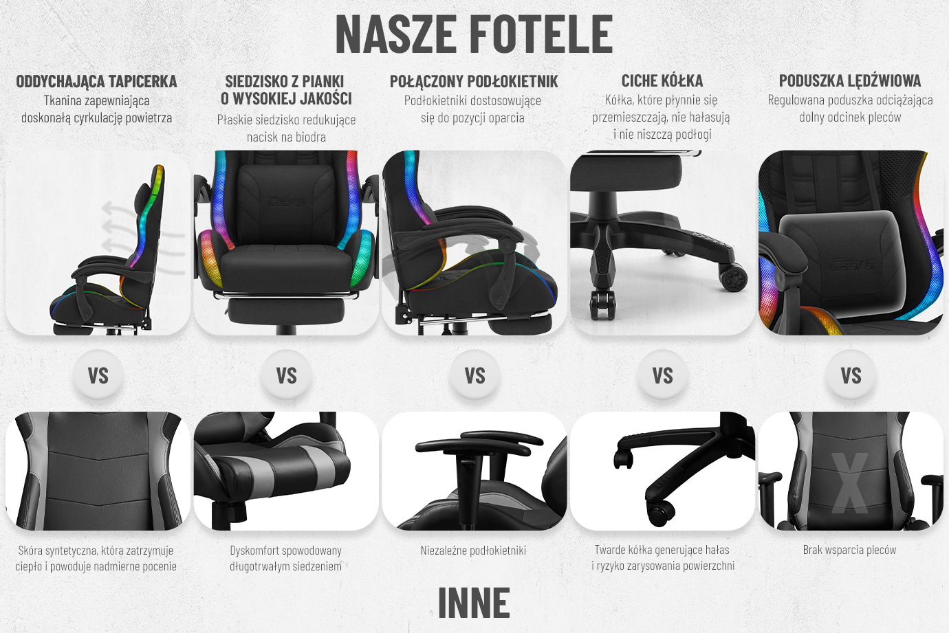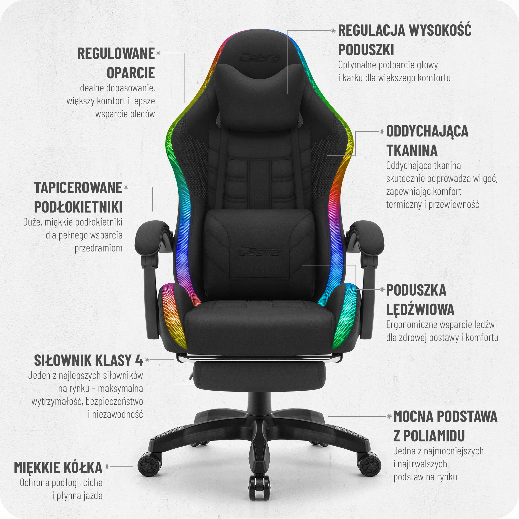 Fotele Cabro C501 zostały zaprojektowane z myślą o graczach, zapewniając idealne wsparcie przez długie godziny intensywnej gry. Dzięki innowacyjnym rozwiązaniom, solidnym materiałom i precyzyjnemu wykonaniu, gwarantujemy niezrównaną wygodę i trwałość, które sprawiają, że nasze fotele to najlepszy wybór.