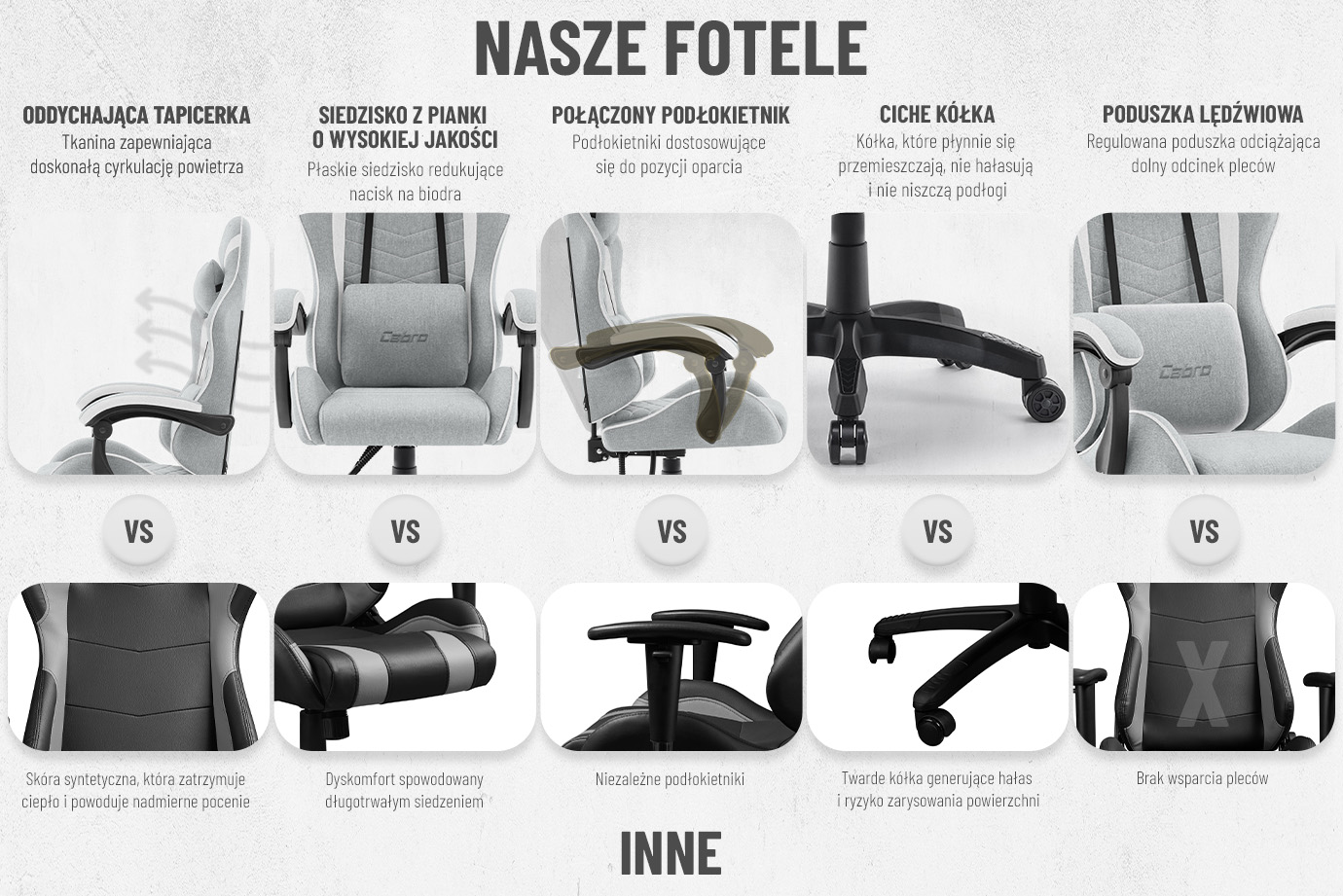 Fotele Cabro C500 zostały zaprojektowane z myślą o graczach, zapewniając idealne wsparcie przez długie godziny intensywnej gry. Dzięki innowacyjnym rozwiązaniom, solidnym materiałom i precyzyjnemu wykonaniu, gwarantujemy niezrównaną wygodę i trwałość, które sprawiają, że nasze fotele to najlepszy wybór.