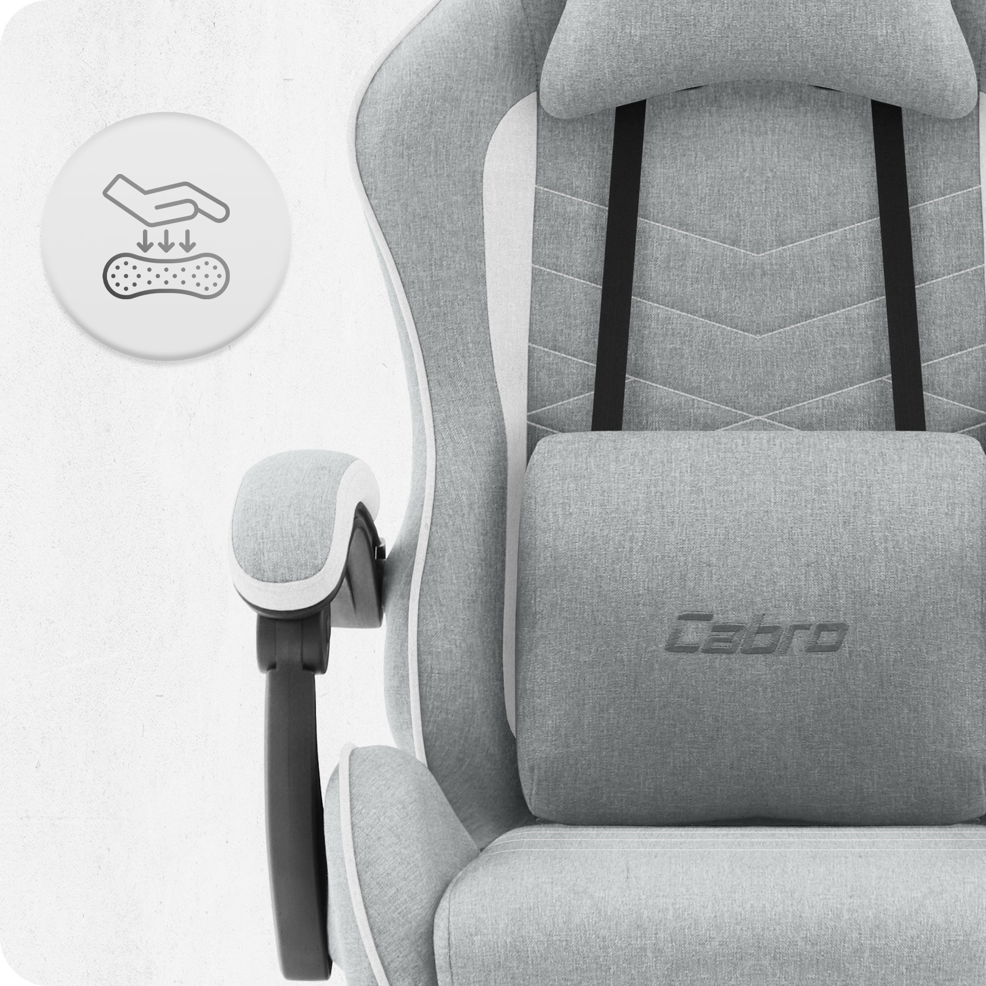Stylowy wygląd szaro-białego fotela Cabro C500 świetnie wpisuje się w estetykę nowoczesnych stanowisk gamingowych. Jego designerskie wykończenie, z delikatnymi białymi przeszyciami i kontrastowymi wstawkami dodaje mu wyjątkowego charakteru. Materiałowe obicie zapewnia wygląd, który będzie doskonale komponować się z każdym wnętrzem.