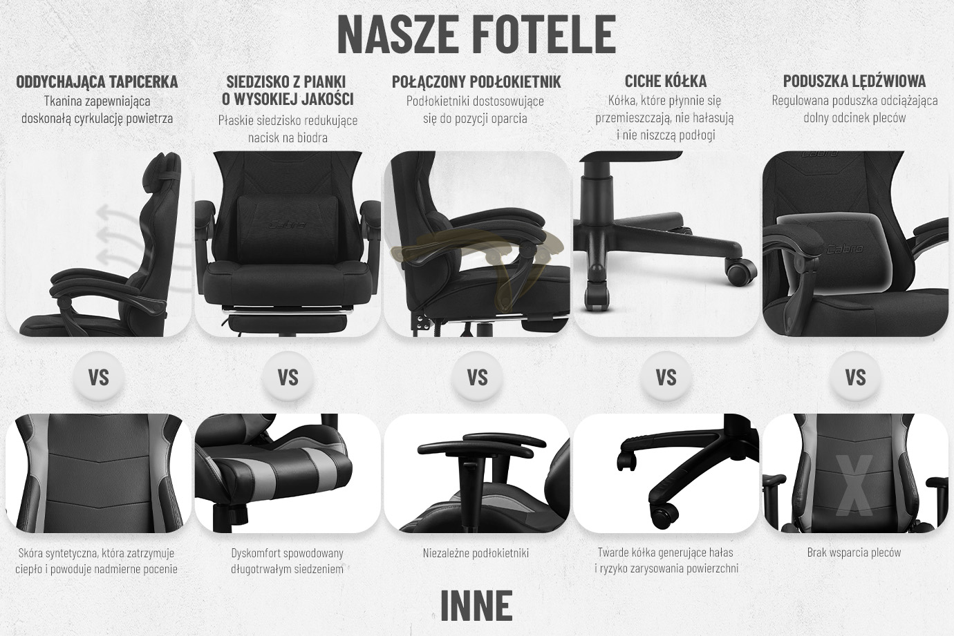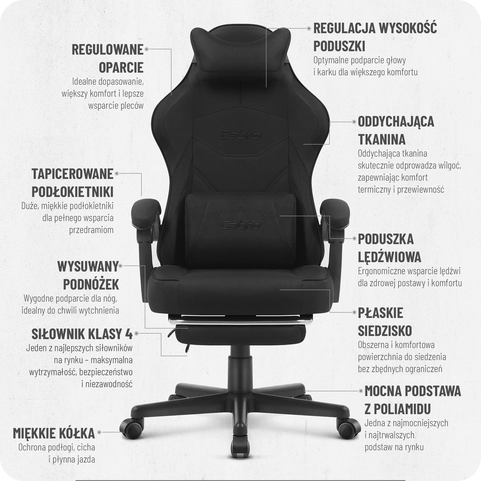 Fotele Cabro C501 zostały zaprojektowane z myślą o graczach, zapewniając idealne wsparcie przez długie godziny intensywnej gry. Dzięki innowacyjnym rozwiązaniom, solidnym materiałom i precyzyjnemu wykonaniu, gwarantujemy niezrównaną wygodę i trwałość, które sprawiają, że nasze fotele to najlepszy wybór.