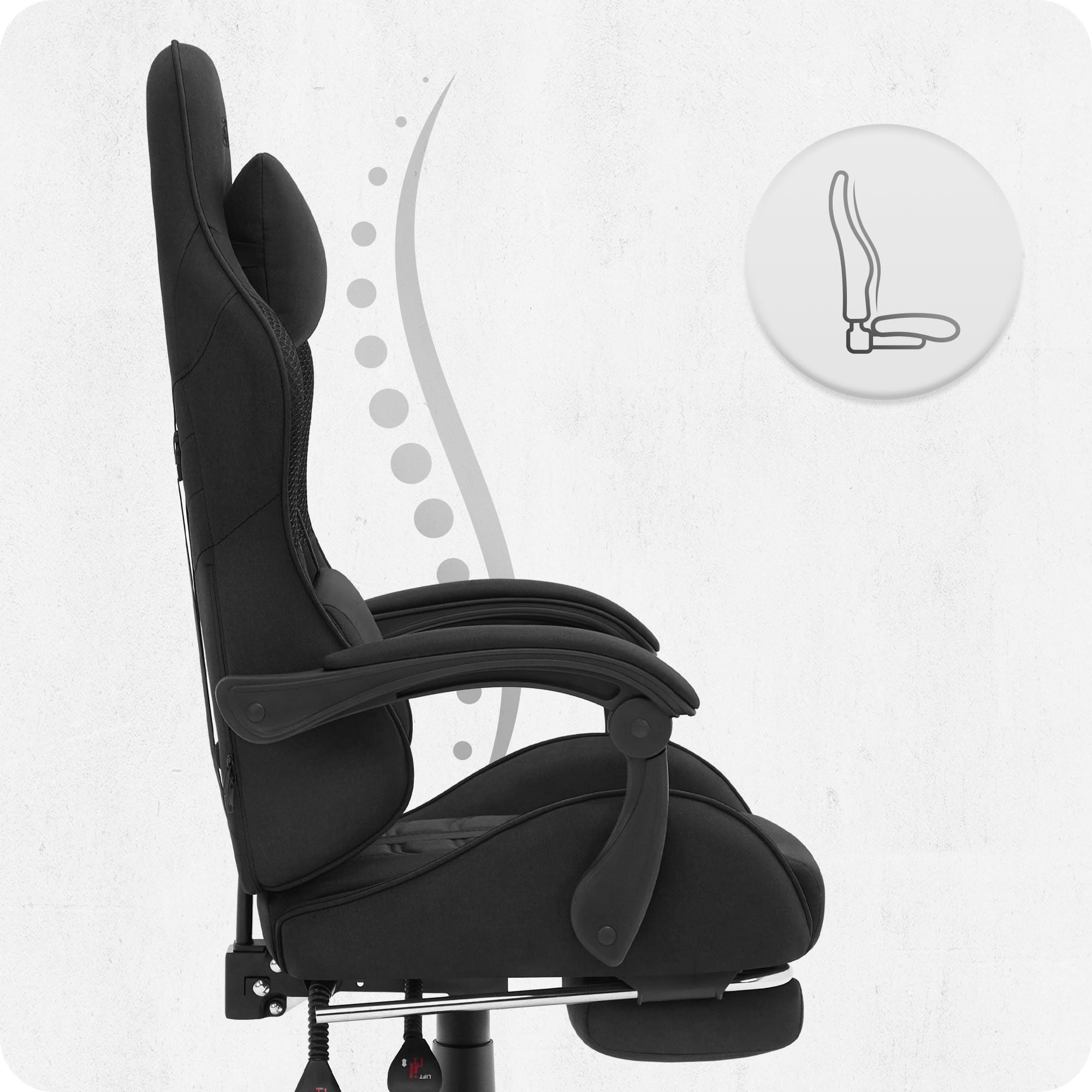 Wyprofilowane podparcie lędźwiowe oraz wsparcie karku i głowy pomagają utrzymać prawidłową postawę niwelując ból kręgosłupa. Poduszki posiadają możliwość regulacji, a także wymiany wypełnienia