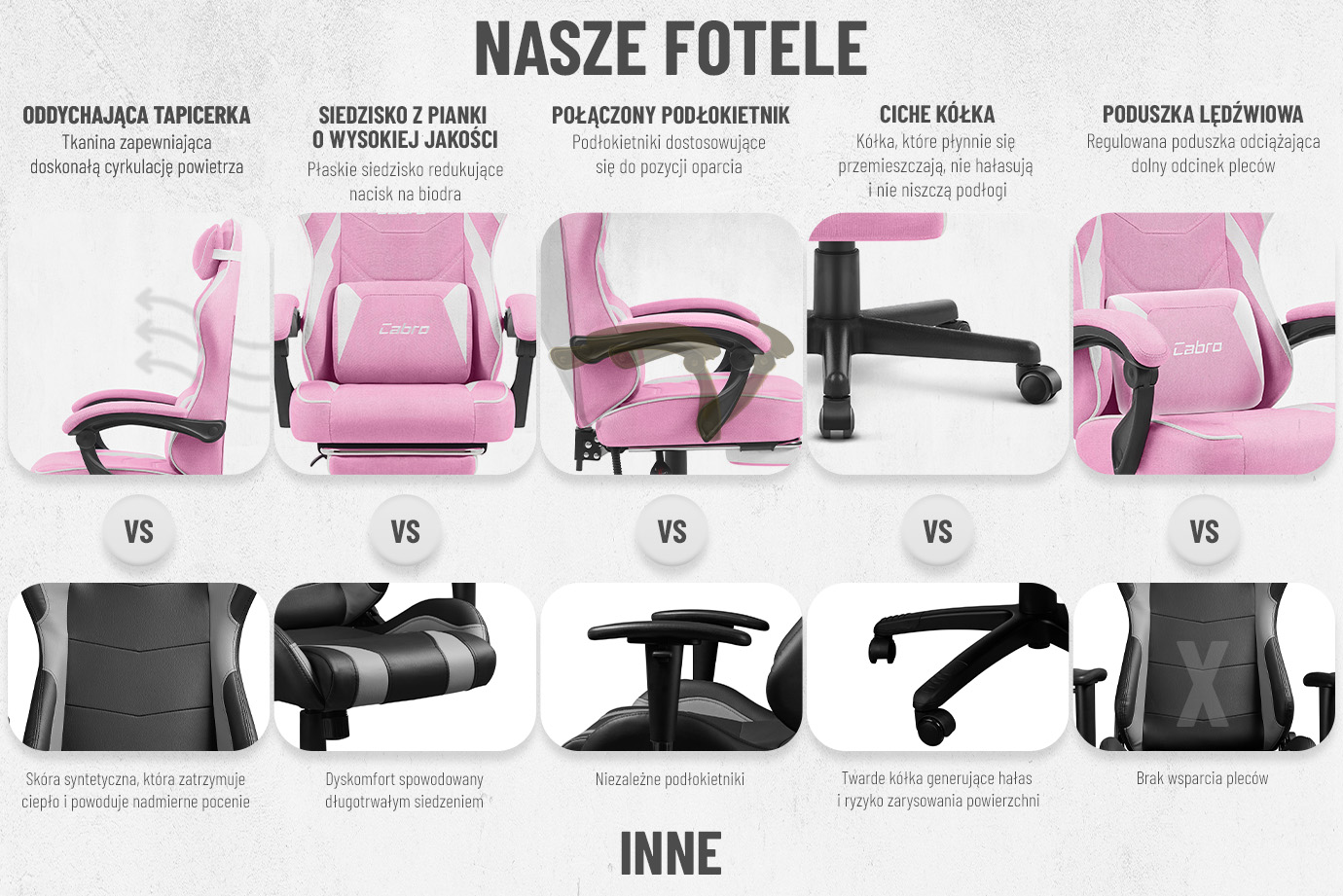 Różowy fotel Cabro C502 zachwyca stylowym designem, idealnie pasującym do nowoczesnych przestrzeni gamingowych. Jego designerskie wykończenie z kontrastowymi białymi wstawkami dodaje muwyjątkowego charakteru, a ergonomiczna konstrukcja z miękkim wypełnieniem zapewnia maksymalny komfort nawet podczas wielogodzinnych rozgrywek.