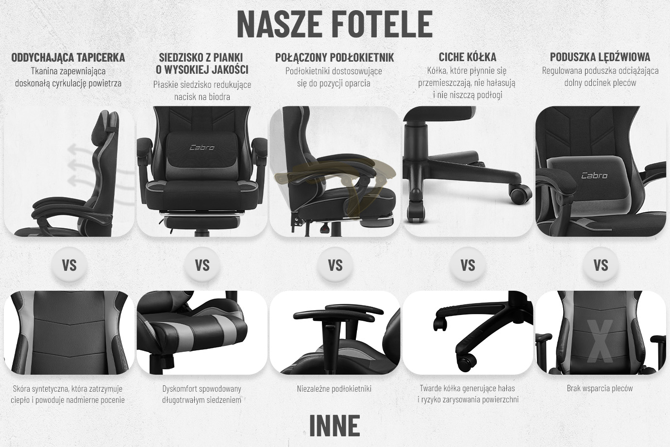 Fotele Cabro C504 zostały zaprojektowane z myślą o graczach, zapewniając idealne wsparcie przez długie godziny intensywnej gry. Dzięki innowacyjnym rozwiązaniom, solidnym materiałom i precyzyjnemu wykonaniu, gwarantujemy niezrównaną wygodę i trwałość, które sprawiają, że nasze fotele to najlepszy wybór.